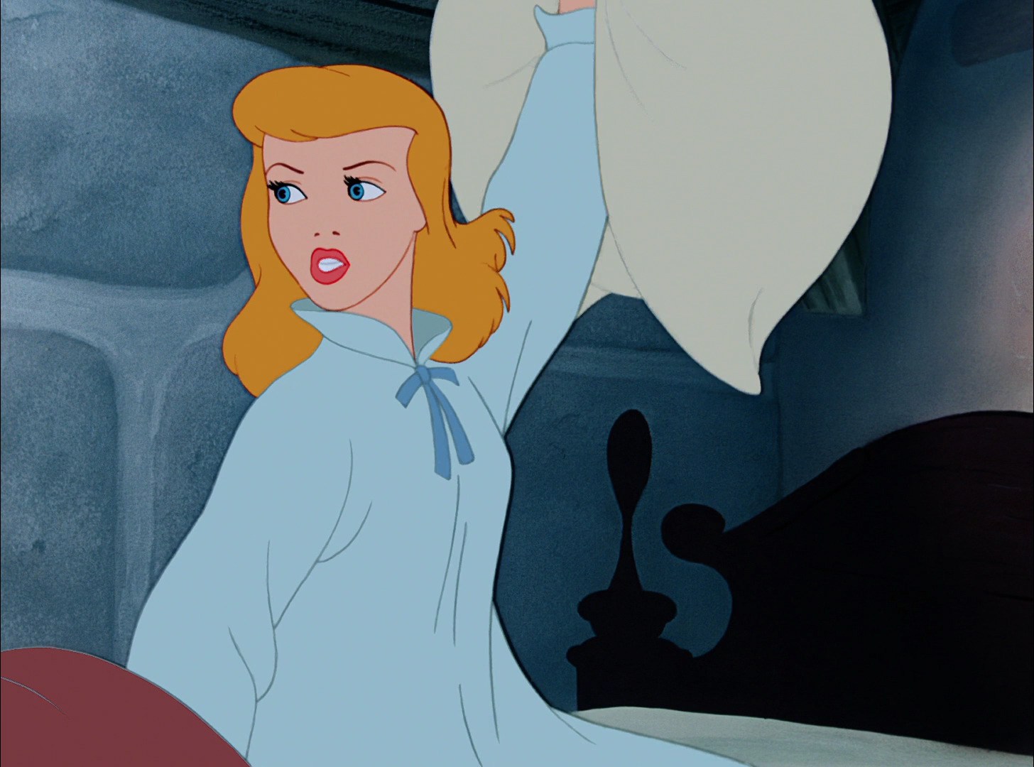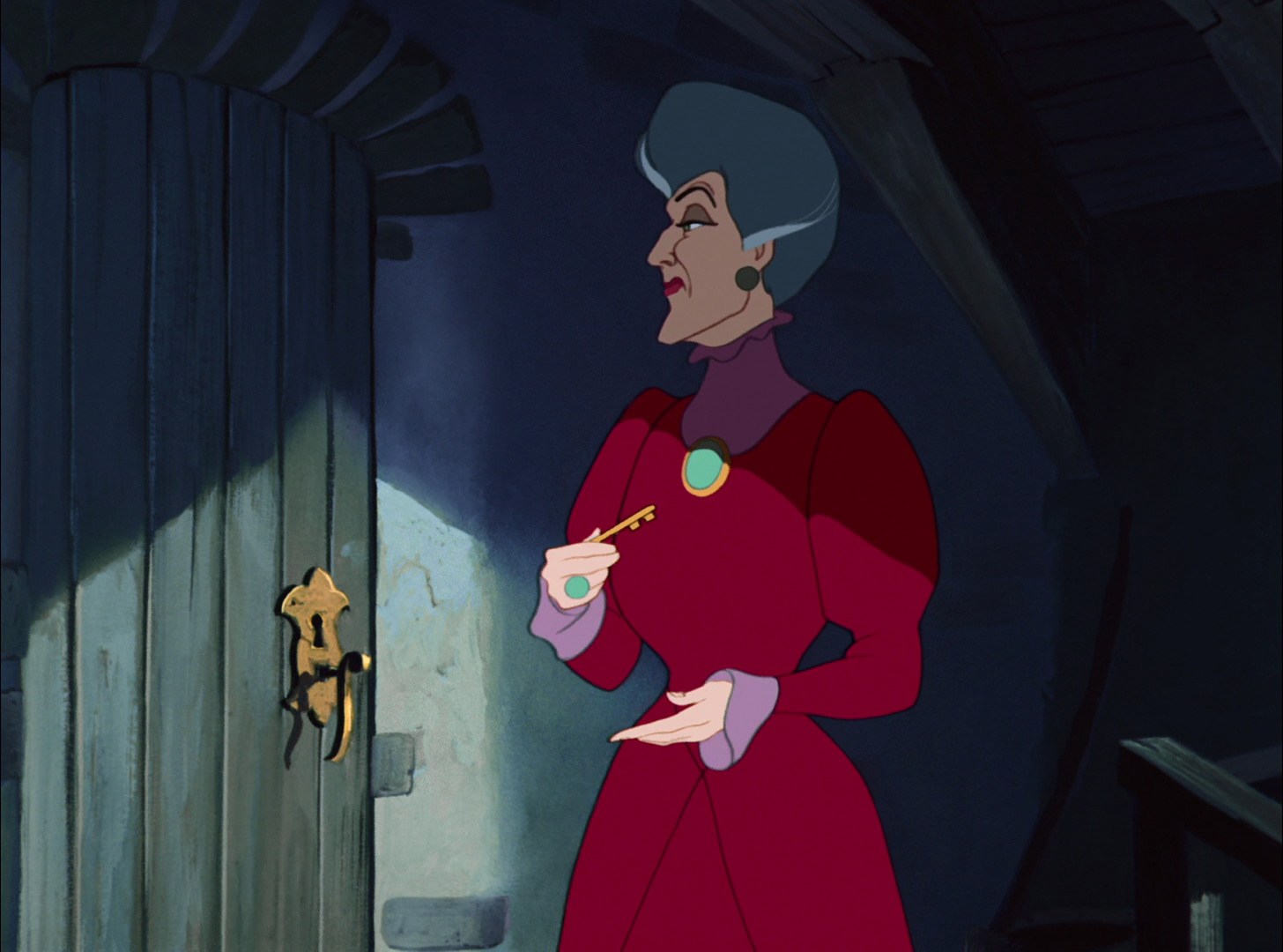 This momentary slip in Cinderella's guard nearly costs her the game of wits she's been playing with her stepmother almost all her cognizant life. Most of the time, Cinderella has played herself off as being unshakable, quiet and docile, hardly having any human emotion at all (just like real abuse survivors), but now Lady Tremaine has seen that Cinderella IS painfully human and thus vulnerable. Thus, Cinderella can be locked in the tower and all will be under control again.