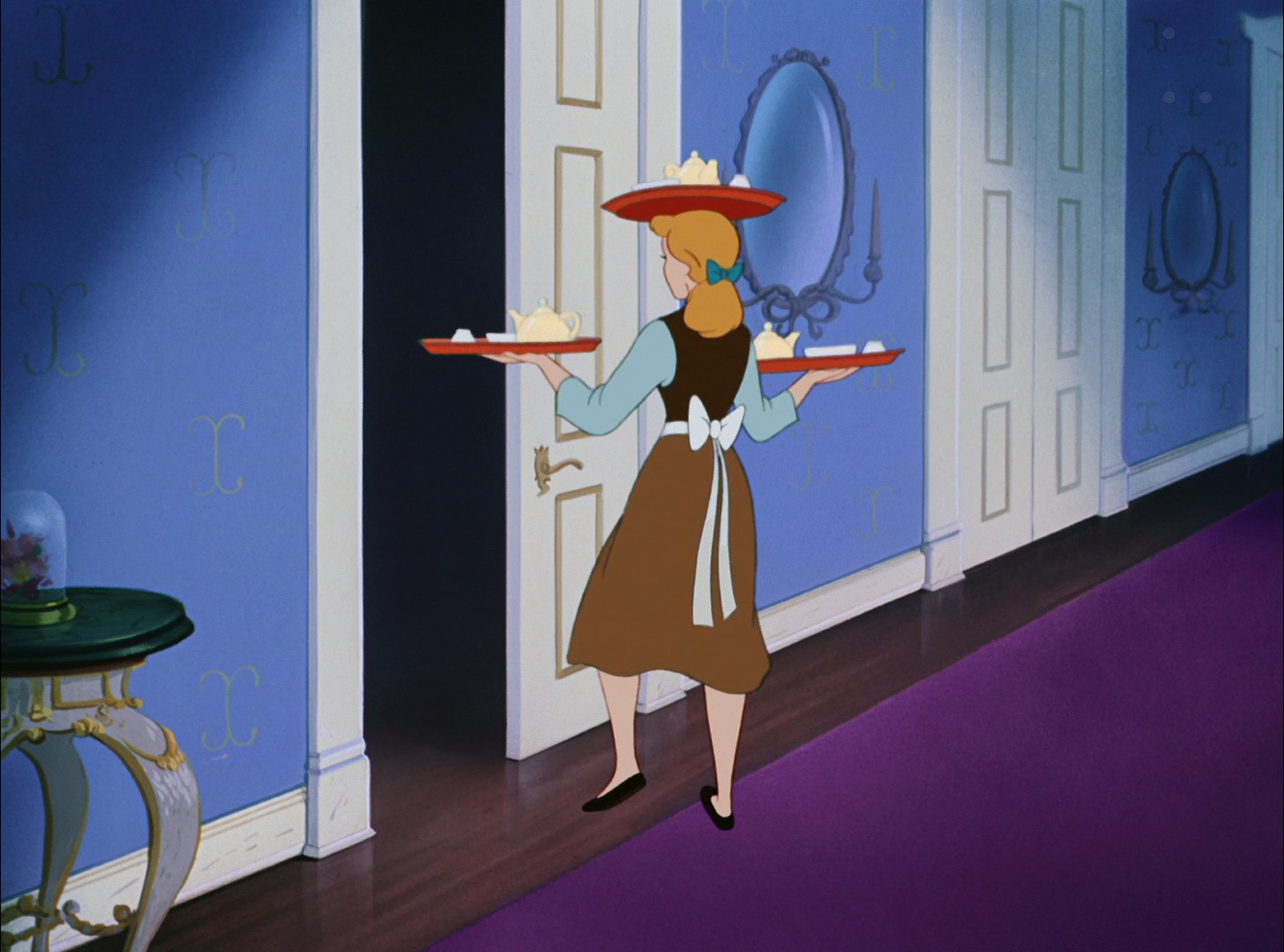 First and foremost, I see Cinderella as smart and savvy. Though she is decidedly not content with her terrible home situation, she does all the unfair work assigned to her (efficiently, might I add), because it's easier than bucking the "system" her stepmother and stepsisters have designed for her. Cinderella is, after all, an abuse survivor--she is fighting a social guerrilla war in her own house. She has learned to work within their system, playing kind and quiet, biding her time until she can break out safely. At the beginning of the film, however, no opportunity for her to safely leave her abusive situation has manifested yet. (When it does, however, as I will discuss below, she makes most of her moves so quietly that no one expects them!)