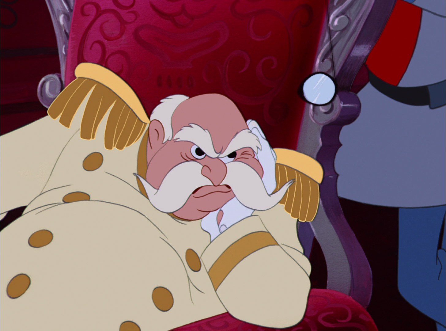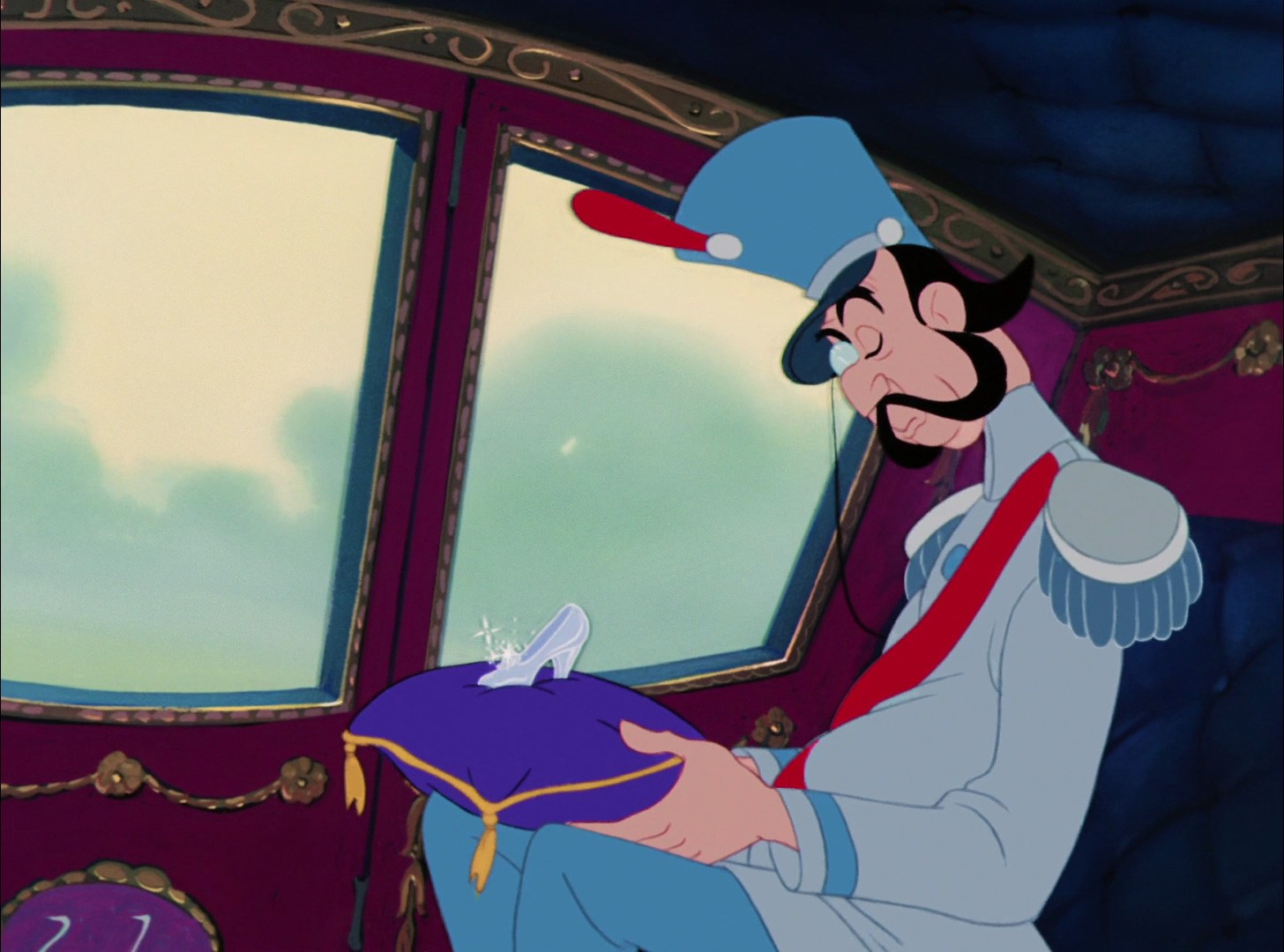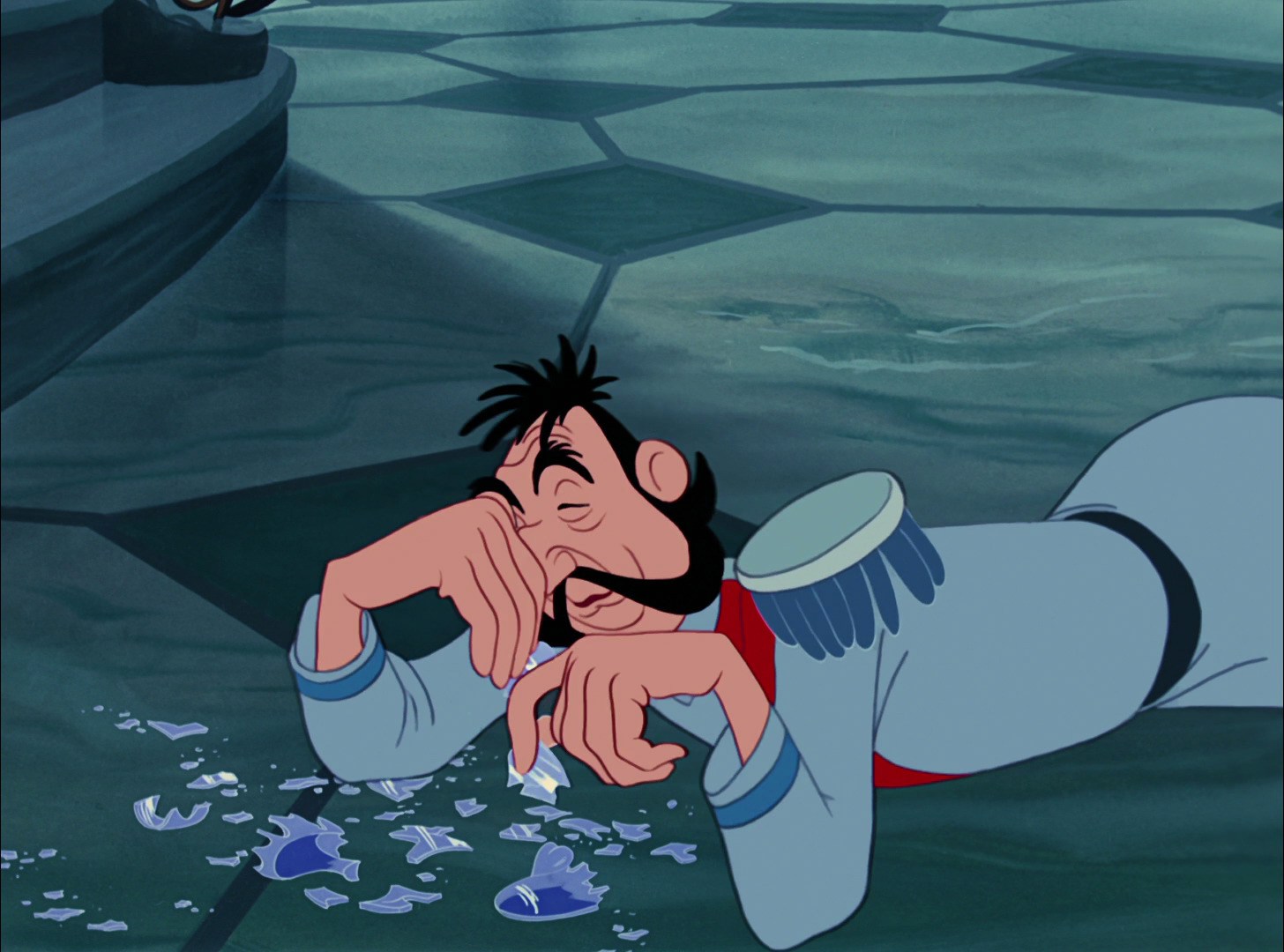Those turns of events lead us directly to that super-dramatic scene with the Duke frantically gathering the pieces of the broken left slipper together, terrified of the king's anger when he learns of this latest snafu. Cinderella says "Well, perhaps, if it would help--" and he interrupts her, saying "No, no, nothing can help now."