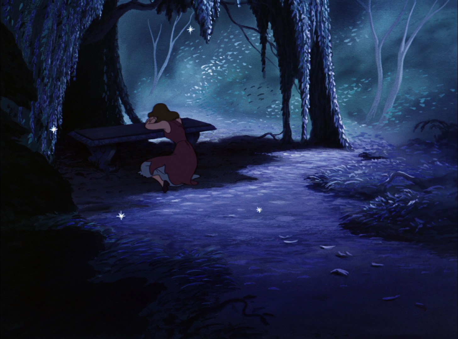 After Anastasia and Drizella rip apart her first dress, Cinderella runs into the garden and cries, and as the song "A Dream is a Wish Your Heart Makes" is sung back to her, she argues with the lyrics she once sang: "No, it isn't true...it's no use, no use at all...I can't believe, not anymore."