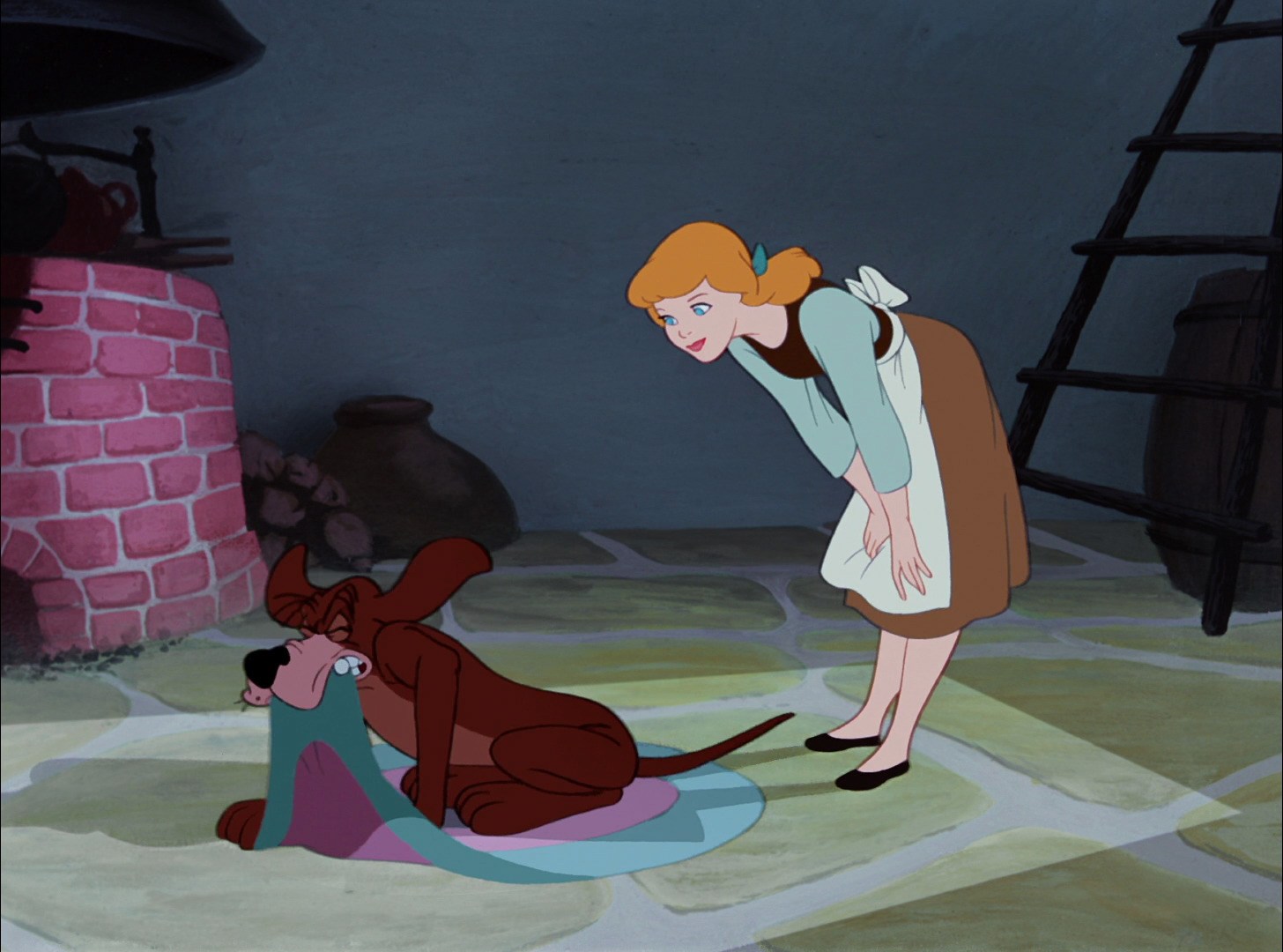 Bruno the dog also conforms to this ideal, aiding Cinderella as a worried (and righteously angry) friend rather than as someone who smugly expects that she will need him because of her inherent weakness as a woman. He has of course been itching for a legal shot at Lucifer since time immemorial, and she has guarded him against such a reckless course of action, but now that his favorite human is trapped because of Lucifer's scheme, he is cleared to act in her defense.