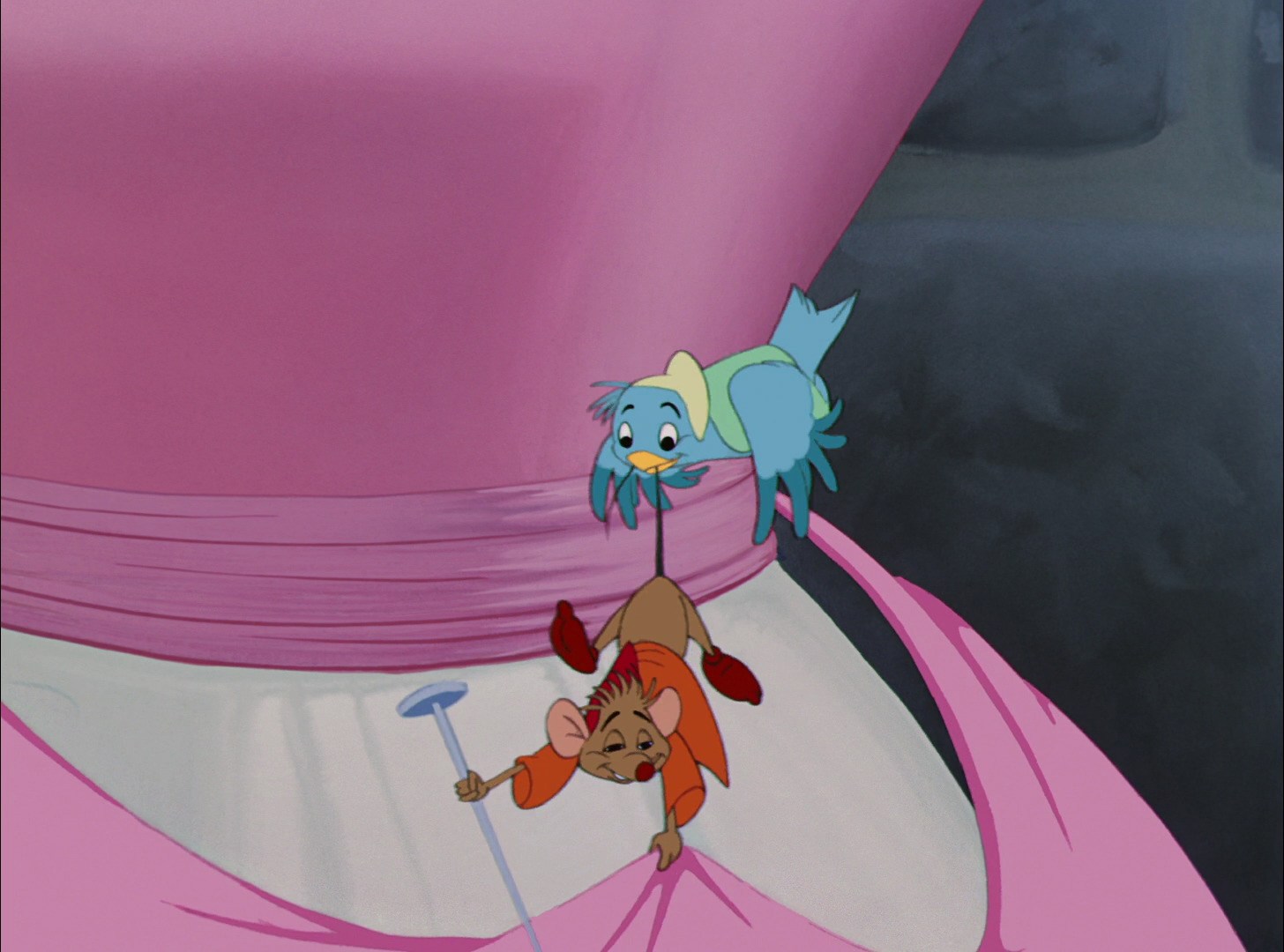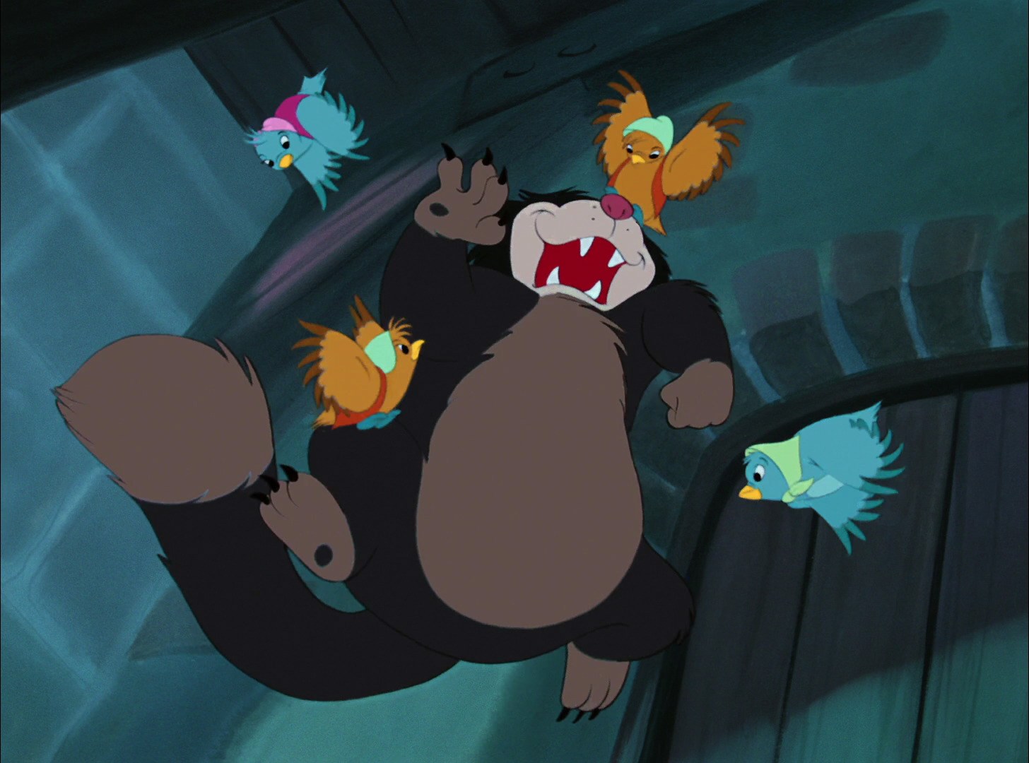 Contrast this with the "good" female characters--the female birds and mice that aid Cinderella as much as they can. Each one, though they are merely supporting characters, are given moments where their skill, intelligence, and thoughtfulness shows through. Like Cinderella, they are dutiful when they need to be (the female mice and birds helping to construct Cinderella's first dress), but not afraid to do dangerous things to help others, too (the female birds joining in the fight against Lucifer at the end of the film by dashing crockery on his head from above). They all know their own worth and they aren't afraid to do whatever they need to do to defend that worth. They don't shy away from their negative emotions, but they don't allow those to spill over onto others, either.
